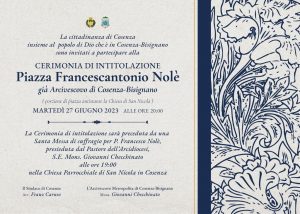 Il Comune di Cosenza ha inteso intitolare la piazza antistante la Parrocchia cittadina di S. Nicola a Mons. Francescantonio Nolè. L’evento avrà luogo MARTEDÌ 27 giugno 2023. Tutti i presbiteri, insieme ai fedeli che vorranno partecipare, si ritroveranno alle ore 19 nella Chiesa di S. Nicola per una concelebrazione eucaristica in suffragio di P. Francesco, […]