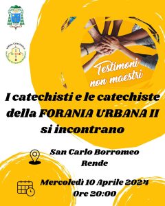 Domenica, 14 aprile, alle ore 16, nella parrocchia San Carlo Borromeo, a Rende, mons. Giovanni Checchinato incontrerà i bambini che riceveranno la prima comunione. L’appuntamento, organizzato dall’Ufficio catechistico della diocesi, si rinnova per l’ennesima volta e costituisce l’occasione per i bambini per ritrovarsi insieme in un pomeriggio di gioia e di festa, oltre che di […]