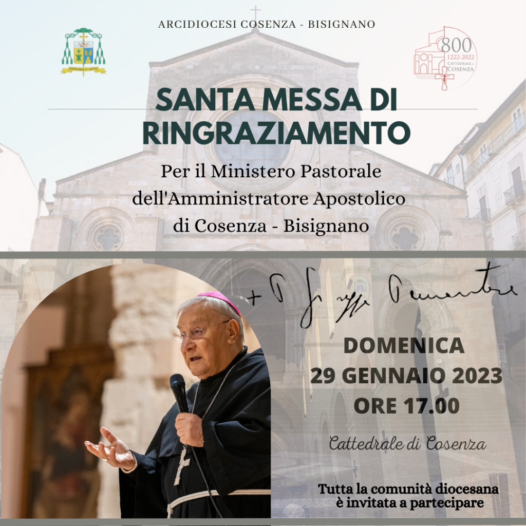 PS. Il giorno 29 gennaio 2023, alle ore 17.00, nella cattedrale di Cosenza celebrerò la messa di ringraziamento a conclusione del mio servizio alla Chiesa di Cosenza-Bisignano. Chiedo a tutti di unirsi alla mia preghiera e a quanti lo desiderano di partecipare alla concelebrazione.