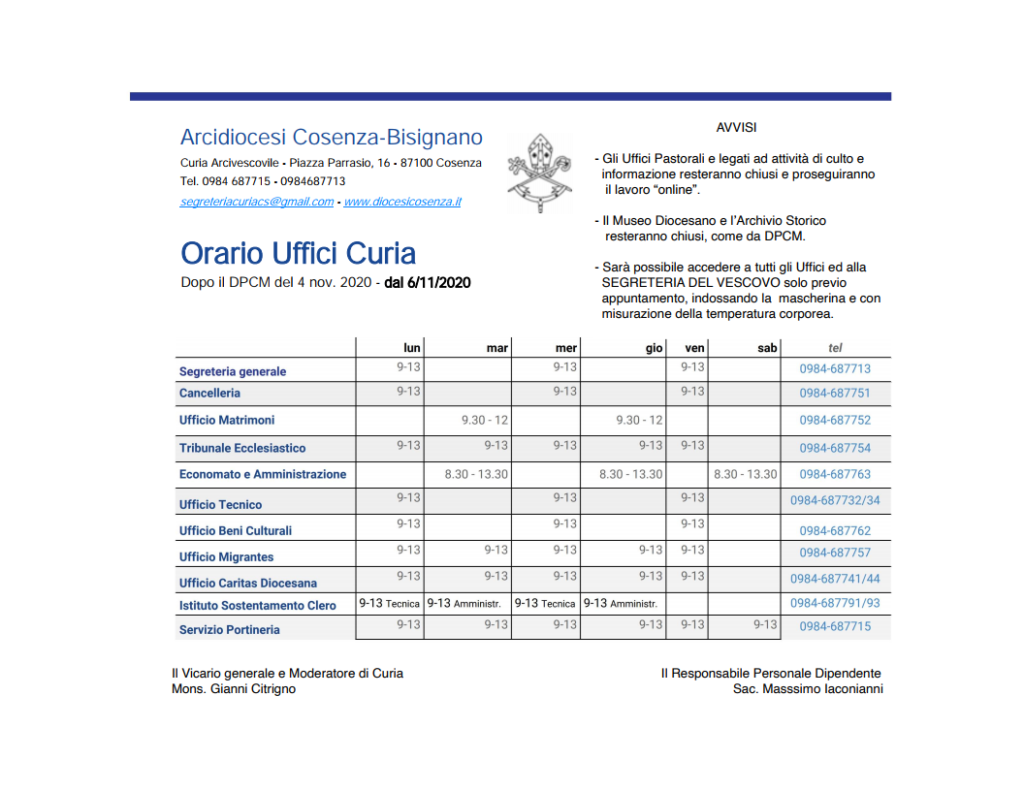 Con riferimento e in ottemperanza a quanto stabilito dal Governo Italiano con il DPCM del 04/11/2020 «misure urgenti di contenimento sull’intero territorio nazionale del diffondersi del virus COVID-19» si comunica che gli Uffici della Curia Diocesana a partire da venerdì 06 novembre, seguiranno le modalità e gli orari di seguito elencati fatta eccezione per i sacerdoti con impegni curiale che da lunedì 09 novembre a venerdì 13 novembre saranno impegnati per gli esercizi spirituali.
