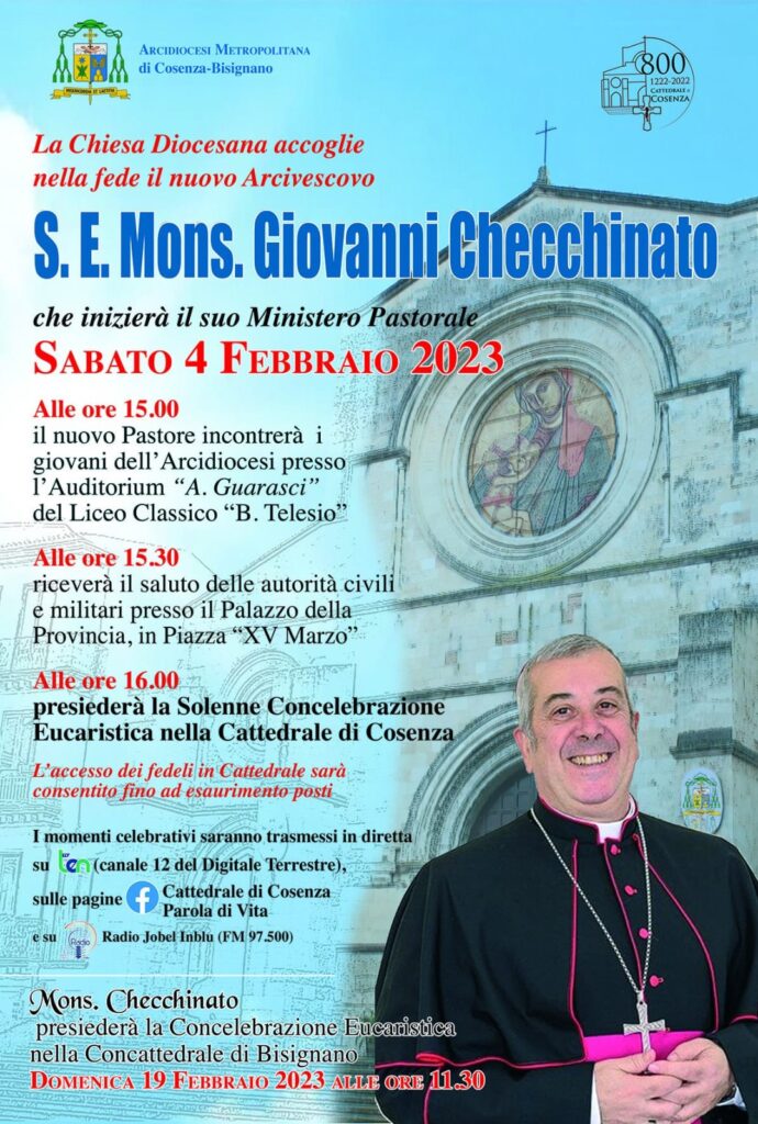 S.E. Mons. Giovanni Checchinato, farà il suo ingresso nell’Arcidiocesi Metropolitana di Cosenza-Bisignano, sabato 4 febbraio alle ore 16:00 nel corso di una solenne Concelebrazione Eucaristica che si terrà nella Cattedrale di Cosenza. Alle ore 15:00 incontrerà i giovani della diocesi nell’auditorium Guarascio del liceo Telesio alle ore 15:30 incontrerà le istituzioni civili e militari.