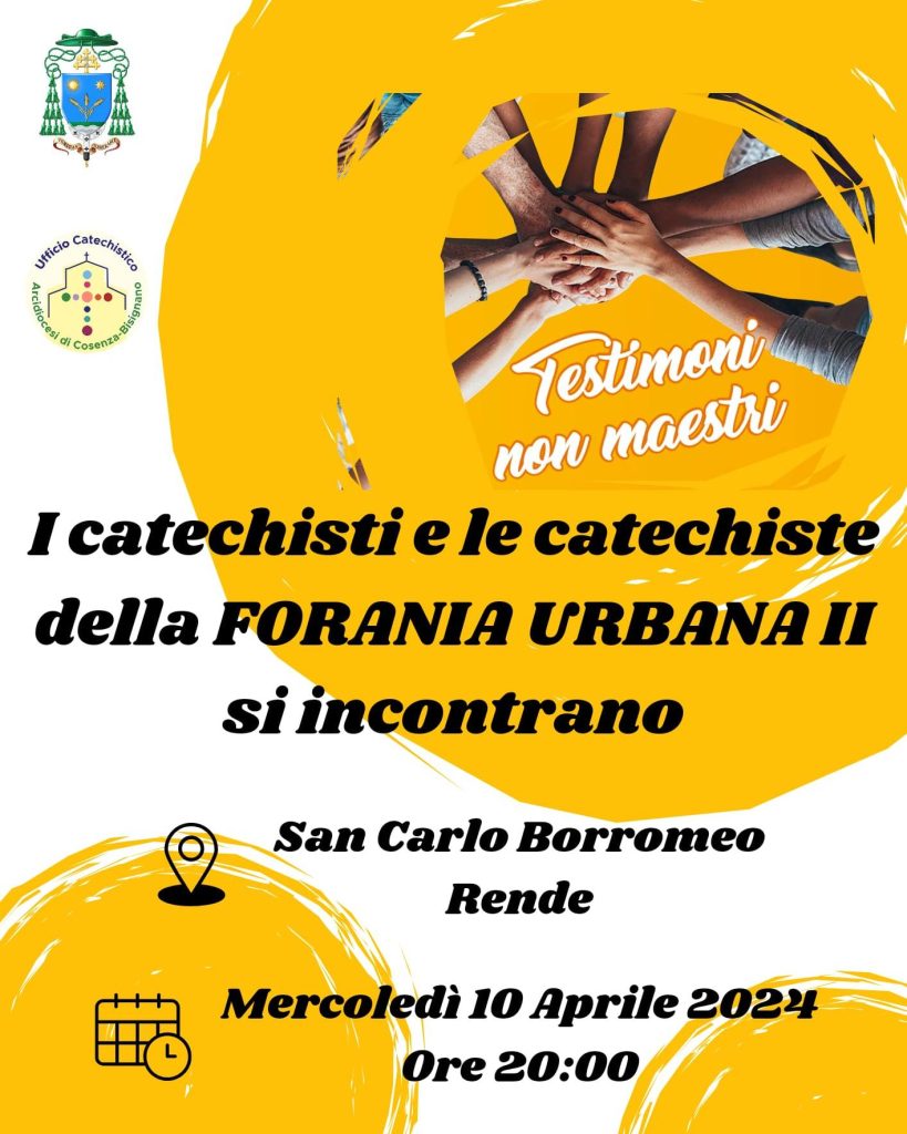 Domenica, 14 aprile, alle ore 16, nella parrocchia San Carlo Borromeo, a Rende, mons. Giovanni Checchinato incontrerà i bambini che riceveranno la prima comunione. L’appuntamento, organizzato dall’Ufficio catechistico della diocesi, si rinnova per l’ennesima volta e costituisce l’occasione per i bambini per ritrovarsi insieme in un pomeriggio di gioia e di festa, oltre che di preghiera, e per conoscere anche il vescovo Giovanni. Nella serata, alle ore 20, i catechisti e le catechiste della forania urbana II si incontreranno sempre nella parrocchia rendese per proseguire con un fraterno momento formativo e di crescita nell’amicizia.